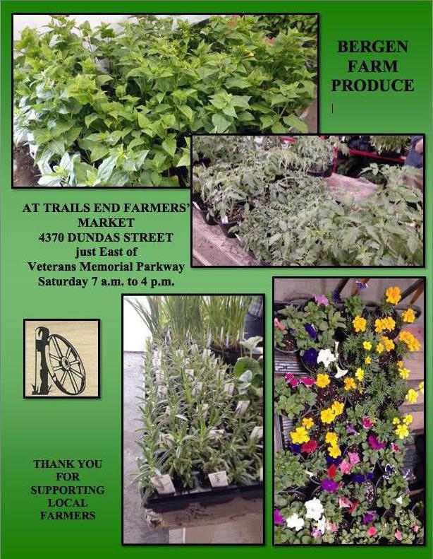 BERGEN FARM PRODUCE, family owned and operated since 1995, is friendly and kind, offering farm fresh local produce for your family. By the quart, the basket, or the bushel, Peter and Helen would be happy to serve your needs with a smile every Saturday at Trails End Farmers’ Market, 4370 Dundas Street just East of Veterans Memorial Parkway, from 7 a.m. to 5 p.m.